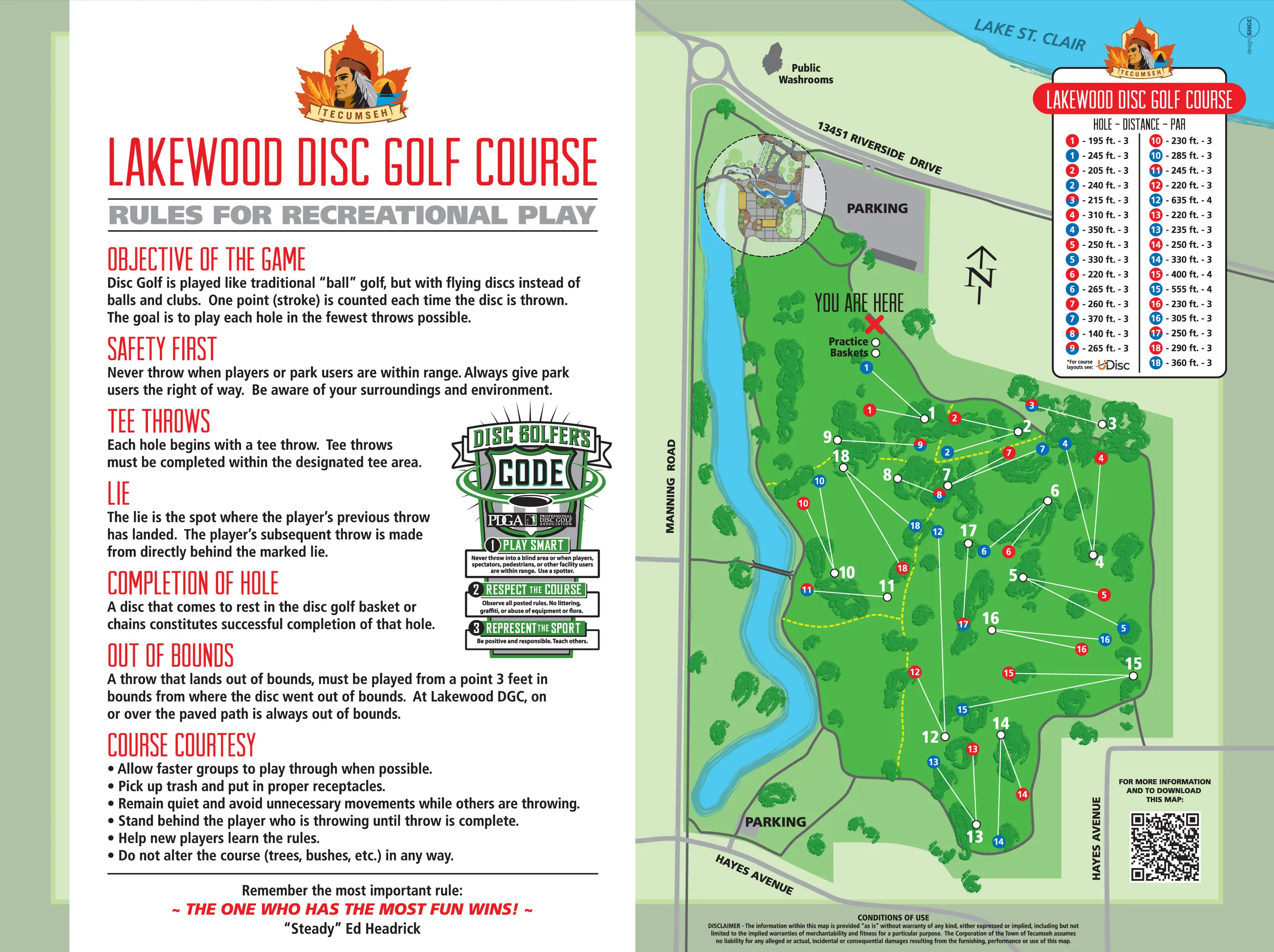 Groups looking to host a Disc Golf Tournament are asked to contact the Tecumseh Community and Recreation Services Department to reserve the park.