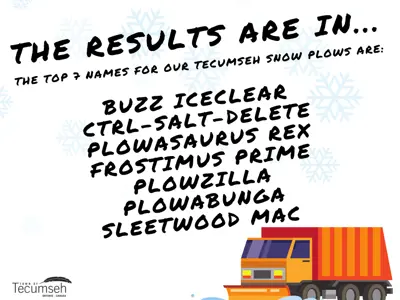 Tecumseh, ON – The Town of Tecumseh is thrilled to announce the names of its seven snowplows for the 2025/2026 winter season, as chosen by the community through the "Name a Snowplow" initiative!
